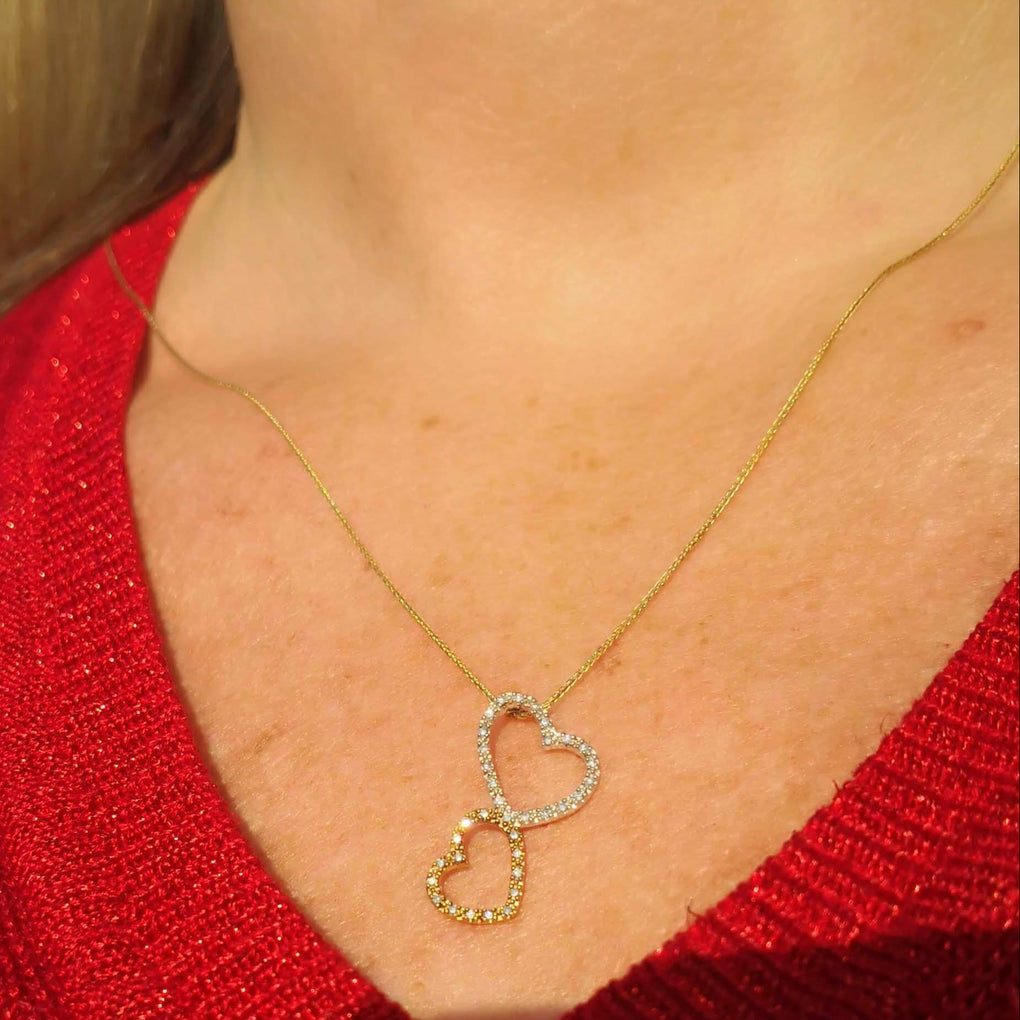 Two Hearts one love! this double heart necklace is a beautiful representation of love .25ctw of glittering diamonds will catch her heart and her eye!!