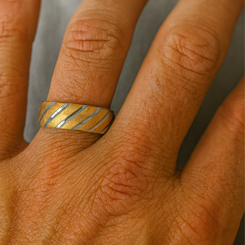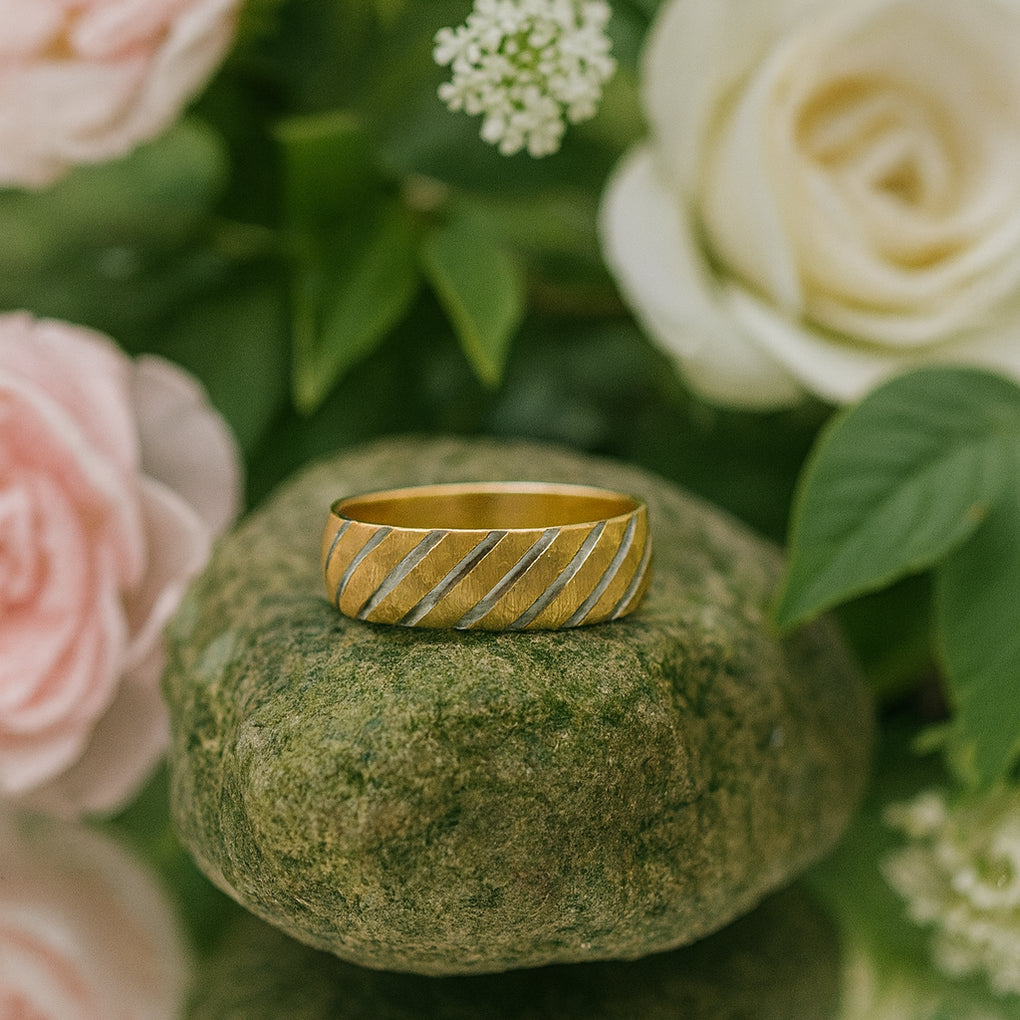 This 14K yellow gold wedding band features a brushed finish with diamond-cut diagonal white gold lines, offering a sleek, textured look with a touch of contrast. The 6.2mm width provides both style and comfort.