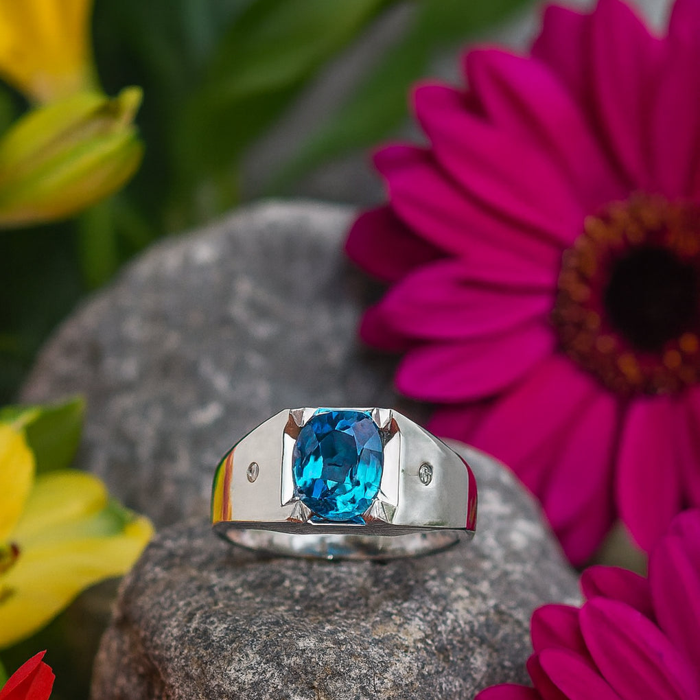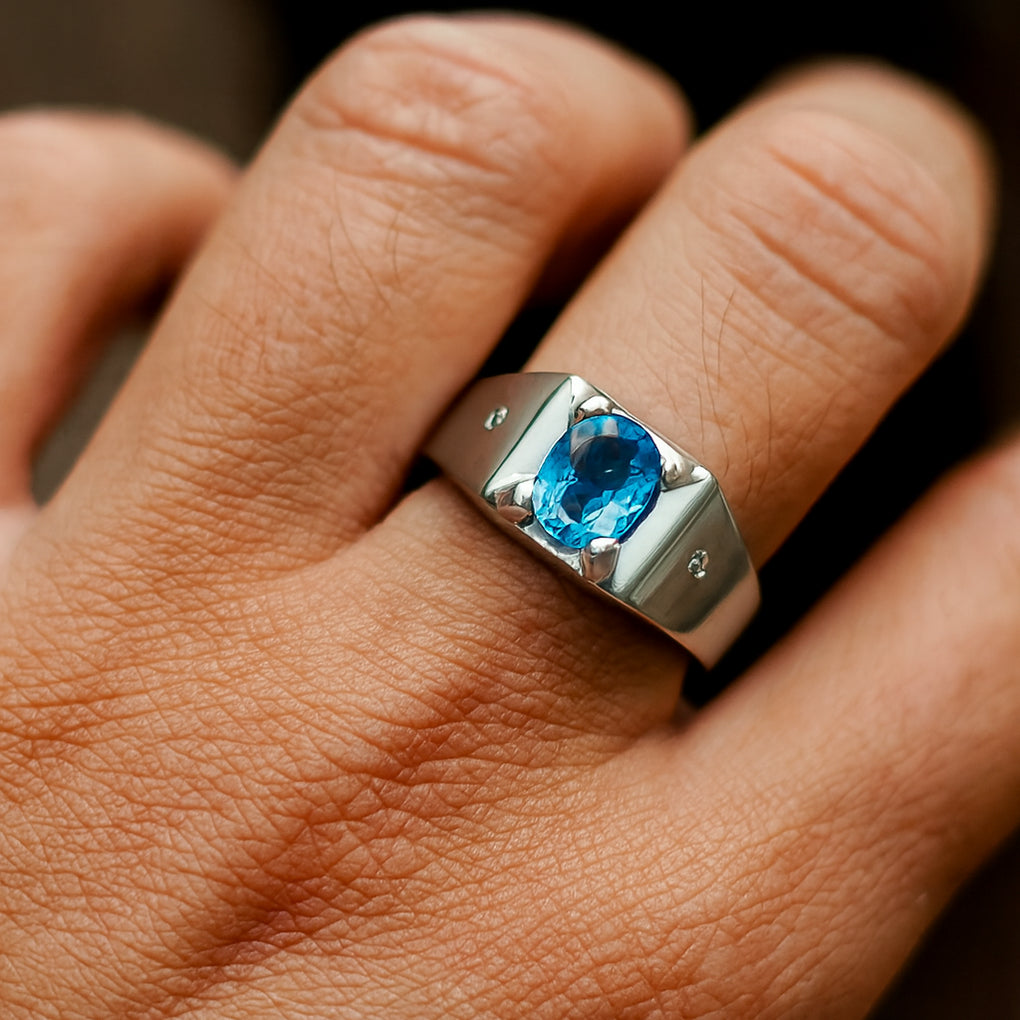 Men's blue topaz and diamond 14kt white gold ring.
