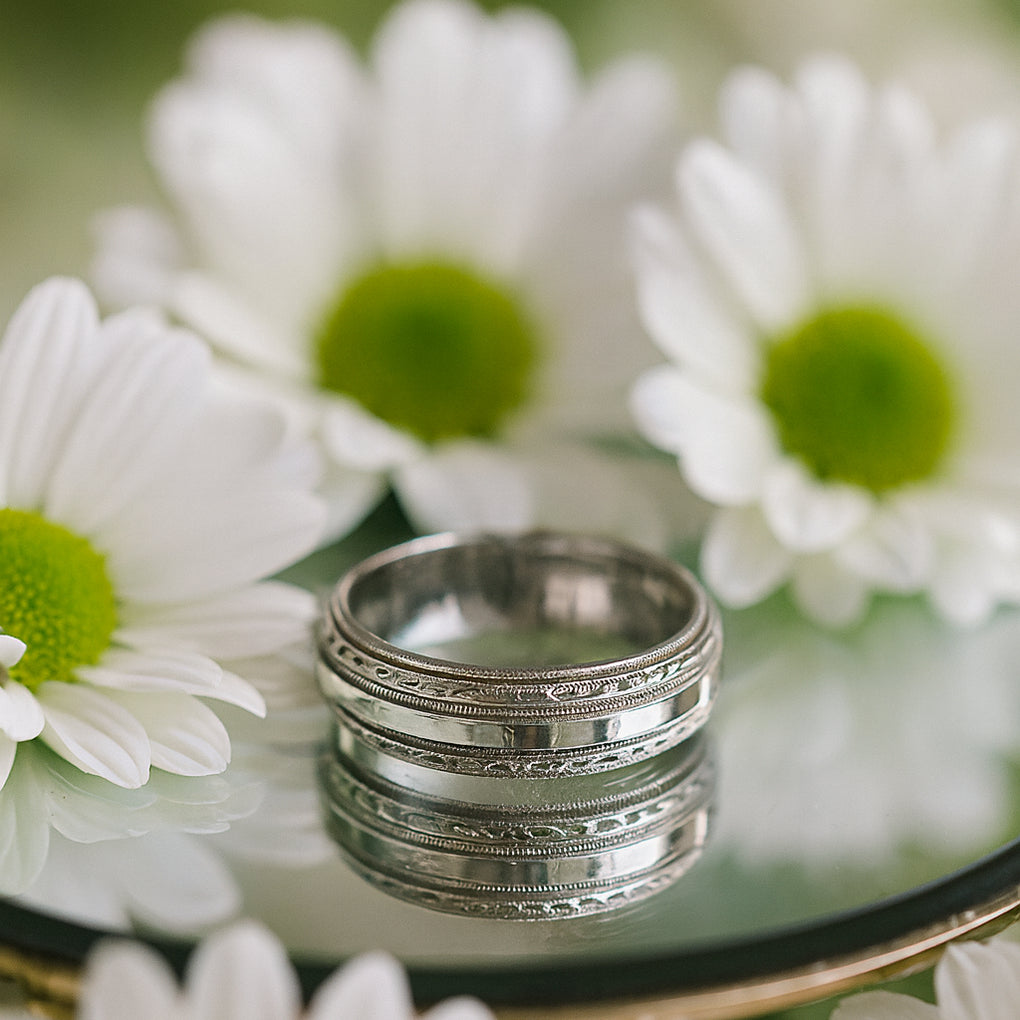This men's 14K white gold wedding band features a classic milgrain design along the edges, adding subtle texture and sophistication. With a 5mm width, it offers a refined and timeless look. Size 10.