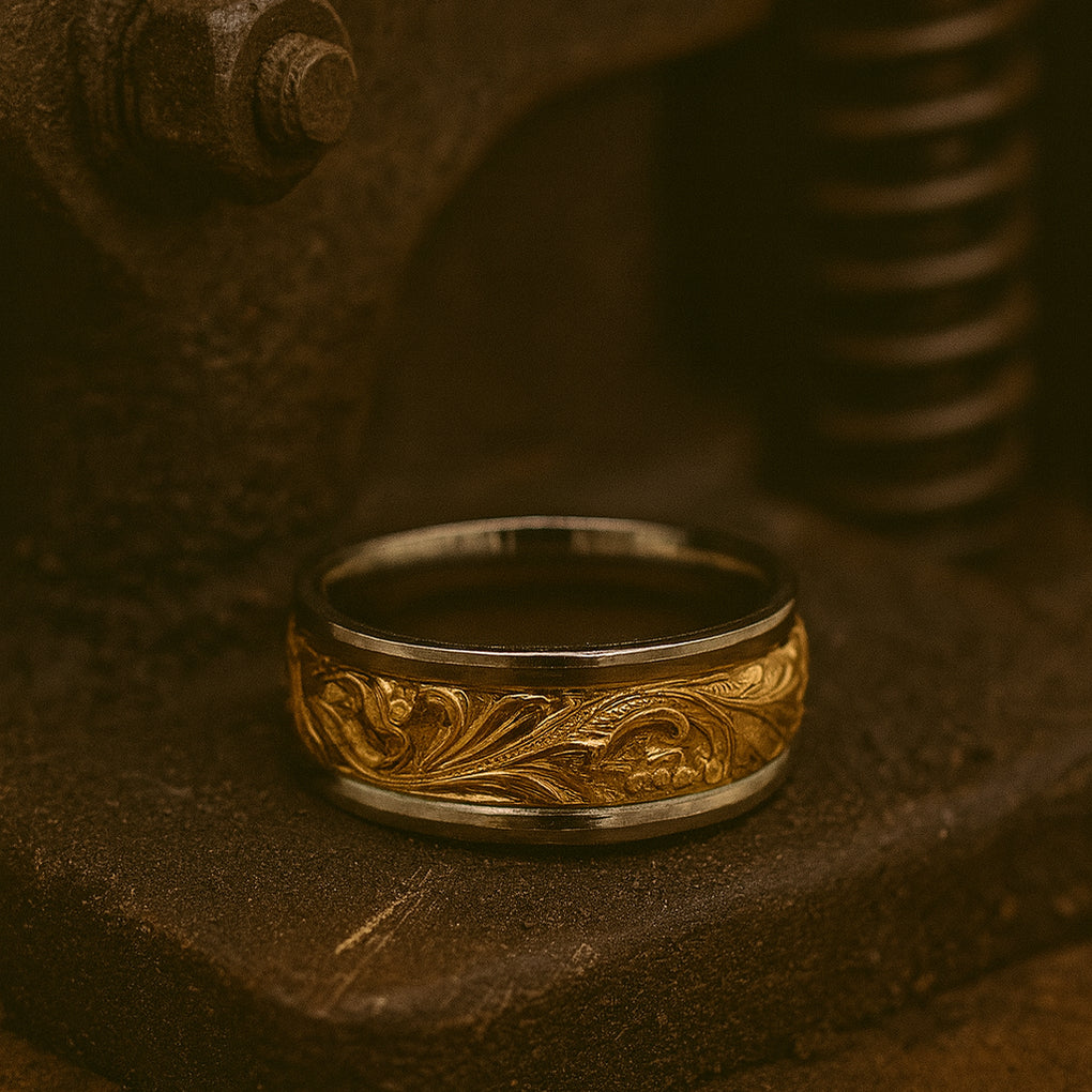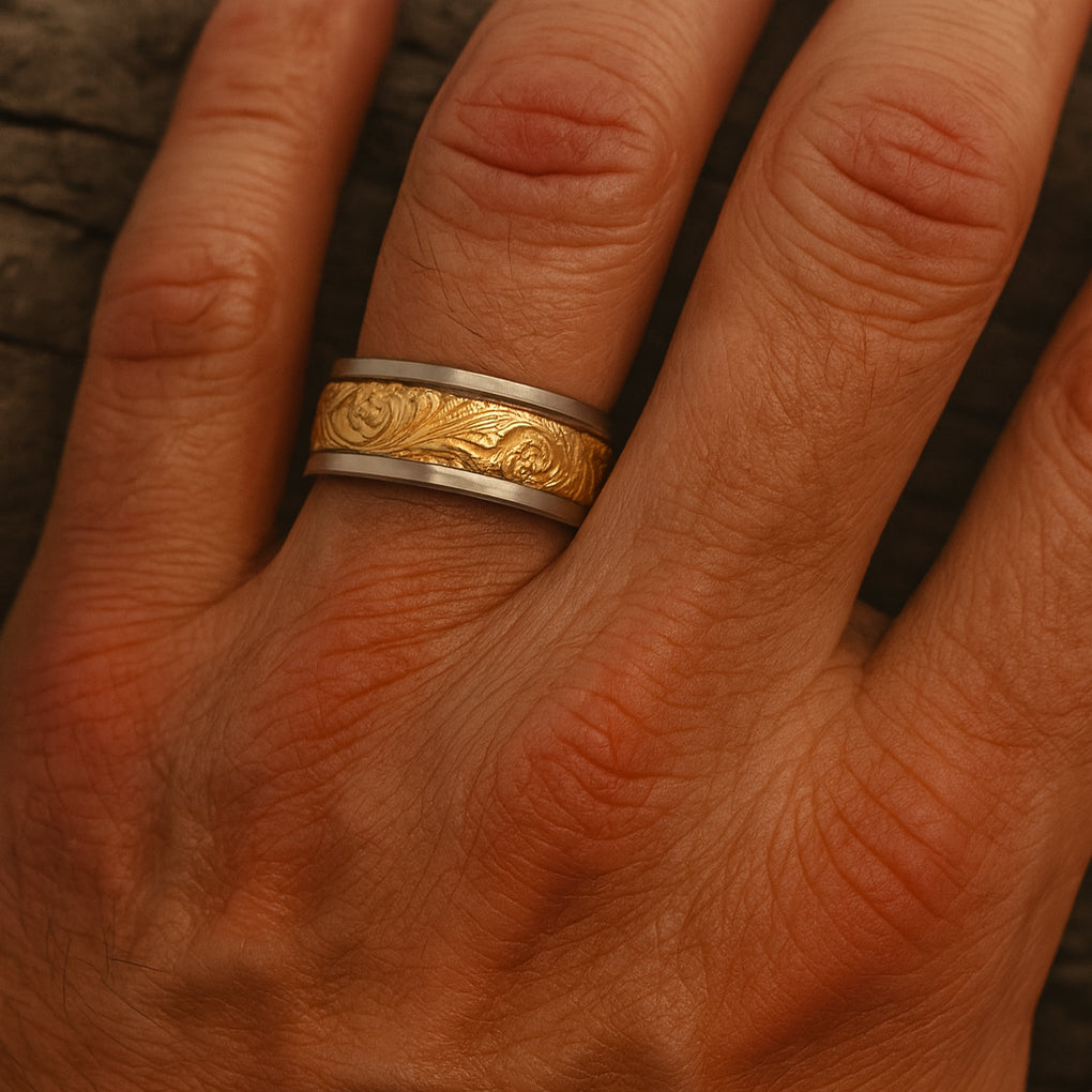This men’s 14K yellow gold band features an intricate Roman Acanthus-inspired floral filigree design, evoking the timeless elegance of classical artistry. Accented by sleek white gold edges, this 8mm band blends historical craftsmanship with refined sophistication.