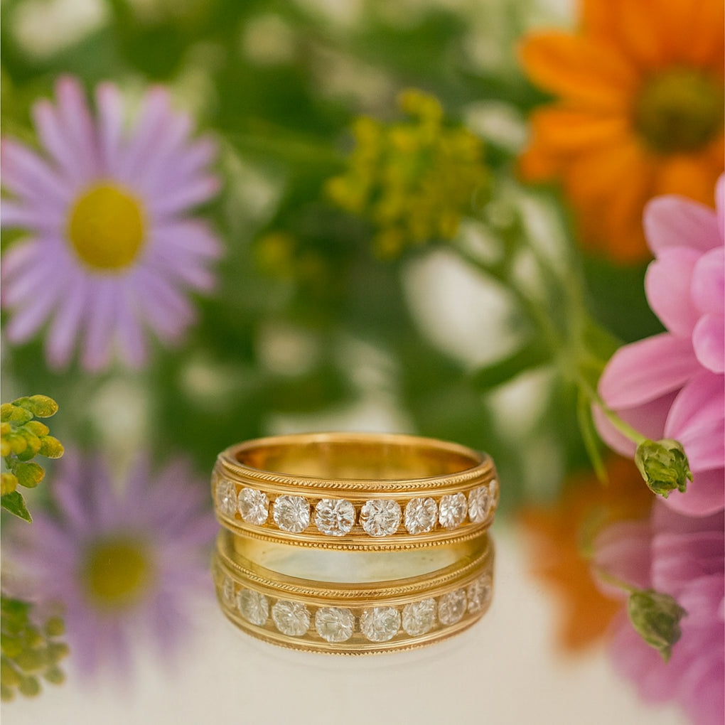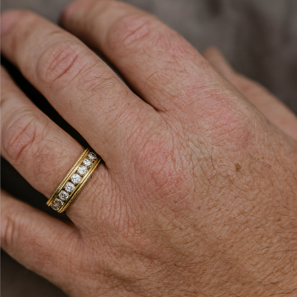 This men's 14K yellow gold wedding band showcases 1.06 total carats of round diamonds (H/I SI3 quality), offering a bold yet refined look. With its timeless design and radiant brilliance, this ring is a statement of style and sophistication.