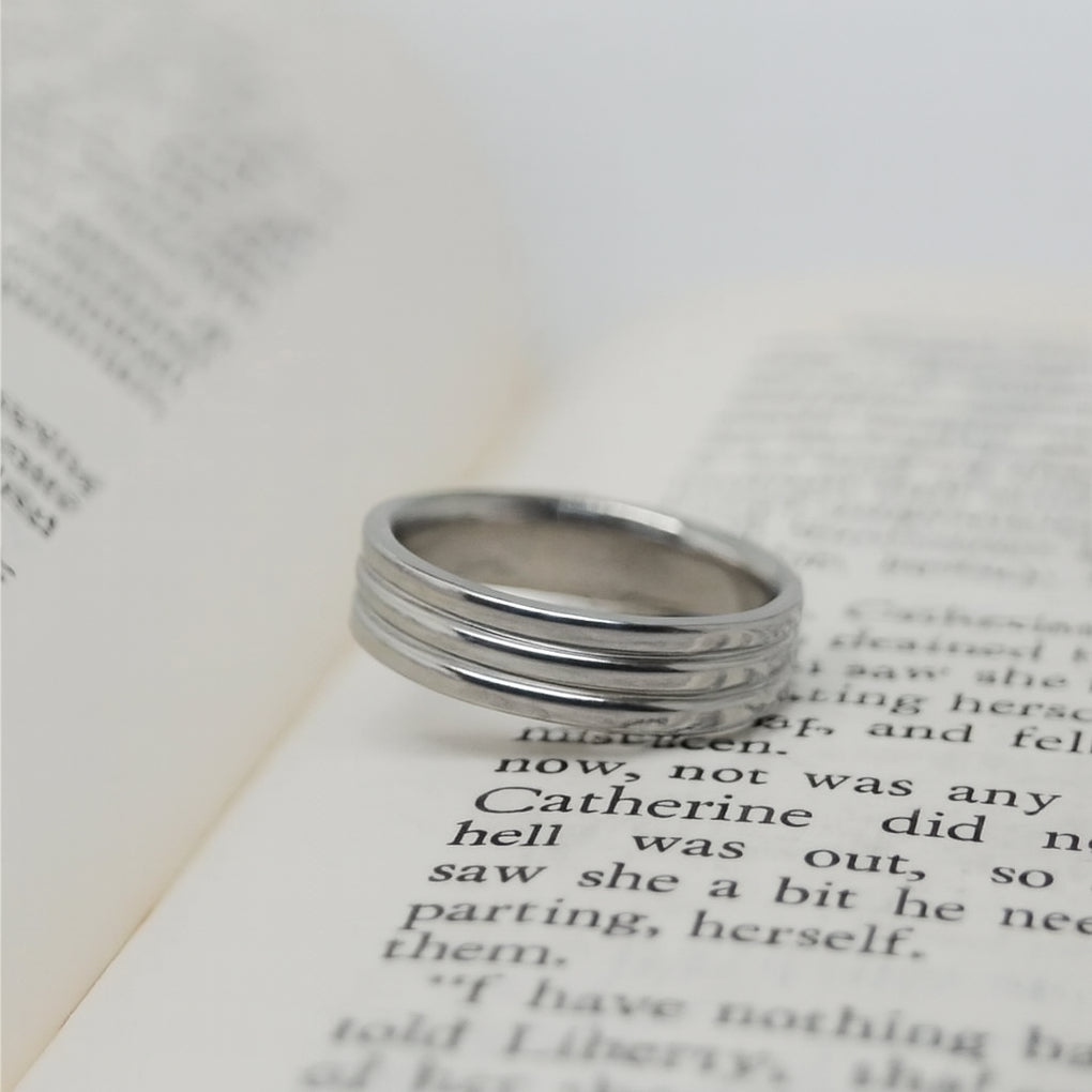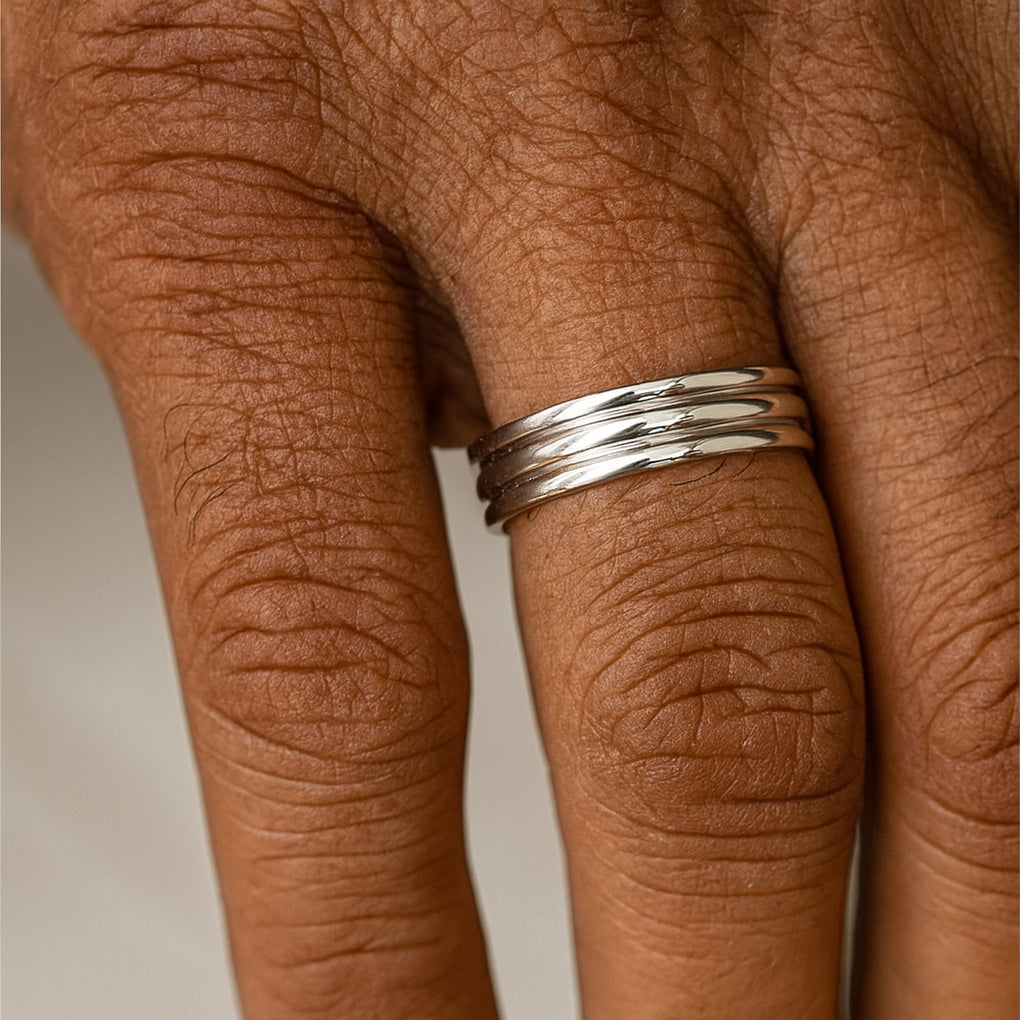 This platinum 5mm triple band features three interwoven bands, creating a bold and distinctive design. With a sleek, polished finish, it combines modern style with lasting durability.