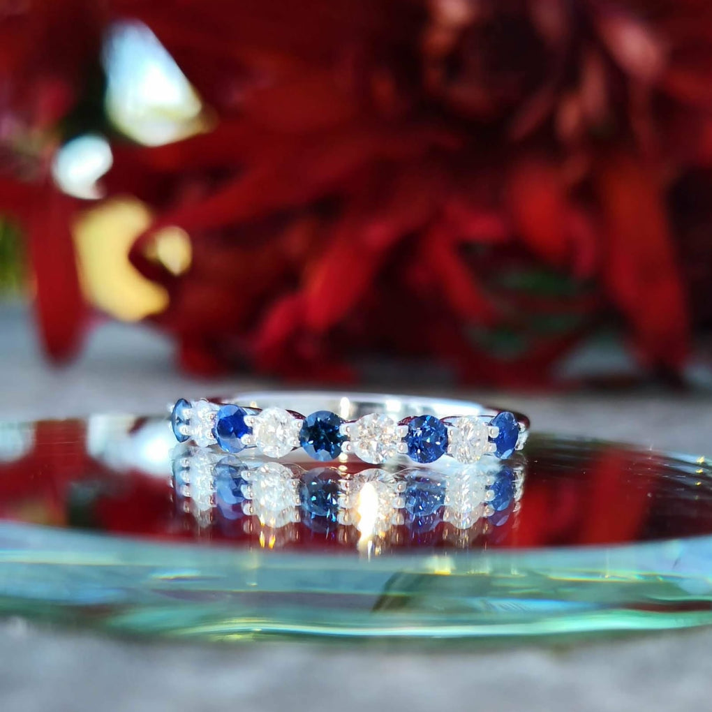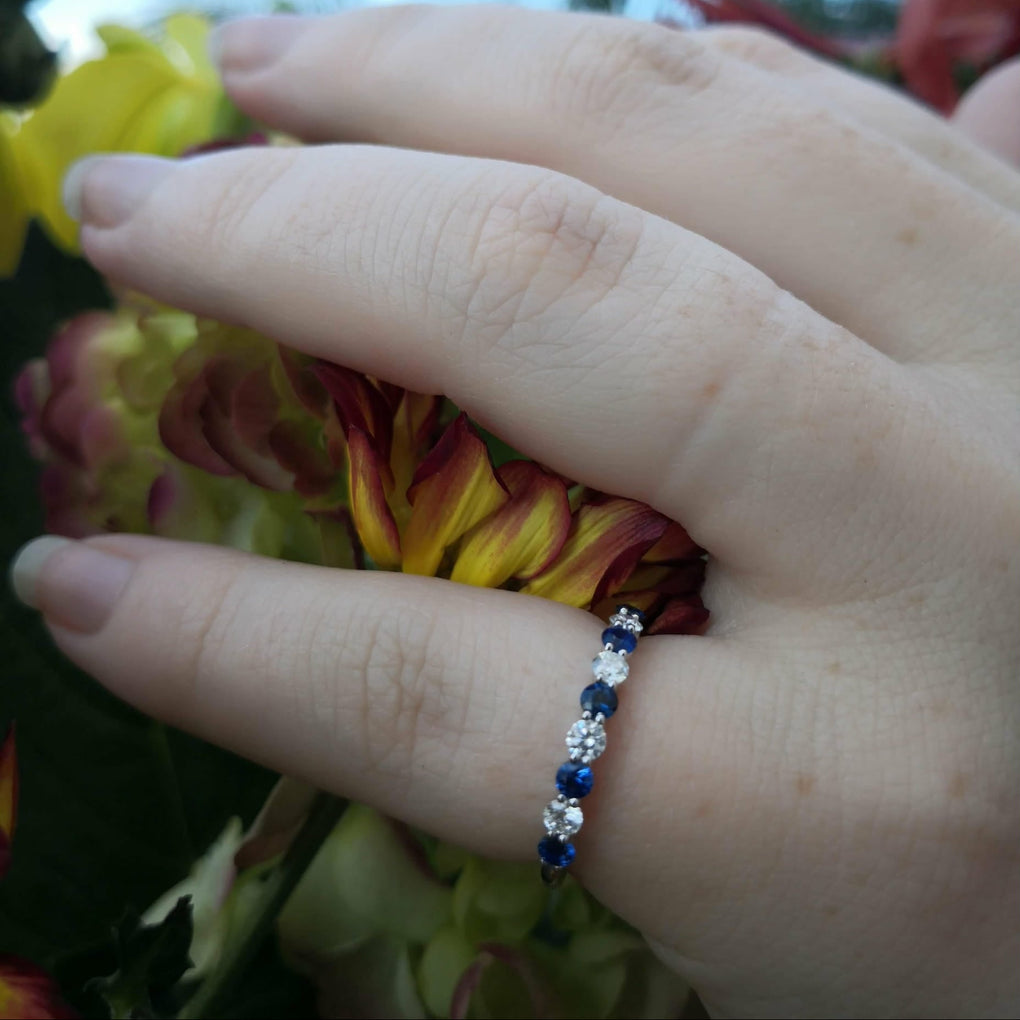 The 7 alternating sapphires and diamonds in this ring are magnificent! A versatile piece that can stand alone or accent an engagement ring. truly beautiful