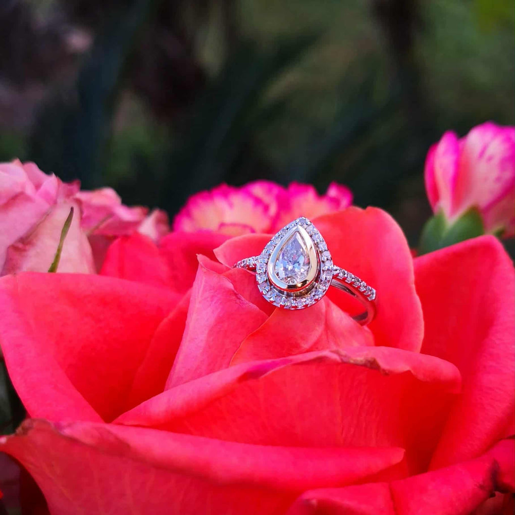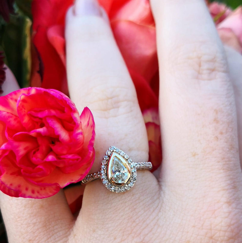 This ring has it all! A beautiful pear shaped diamond surrounded by a bright yellow gold bezel, a halo of sparkly accent diamonds.