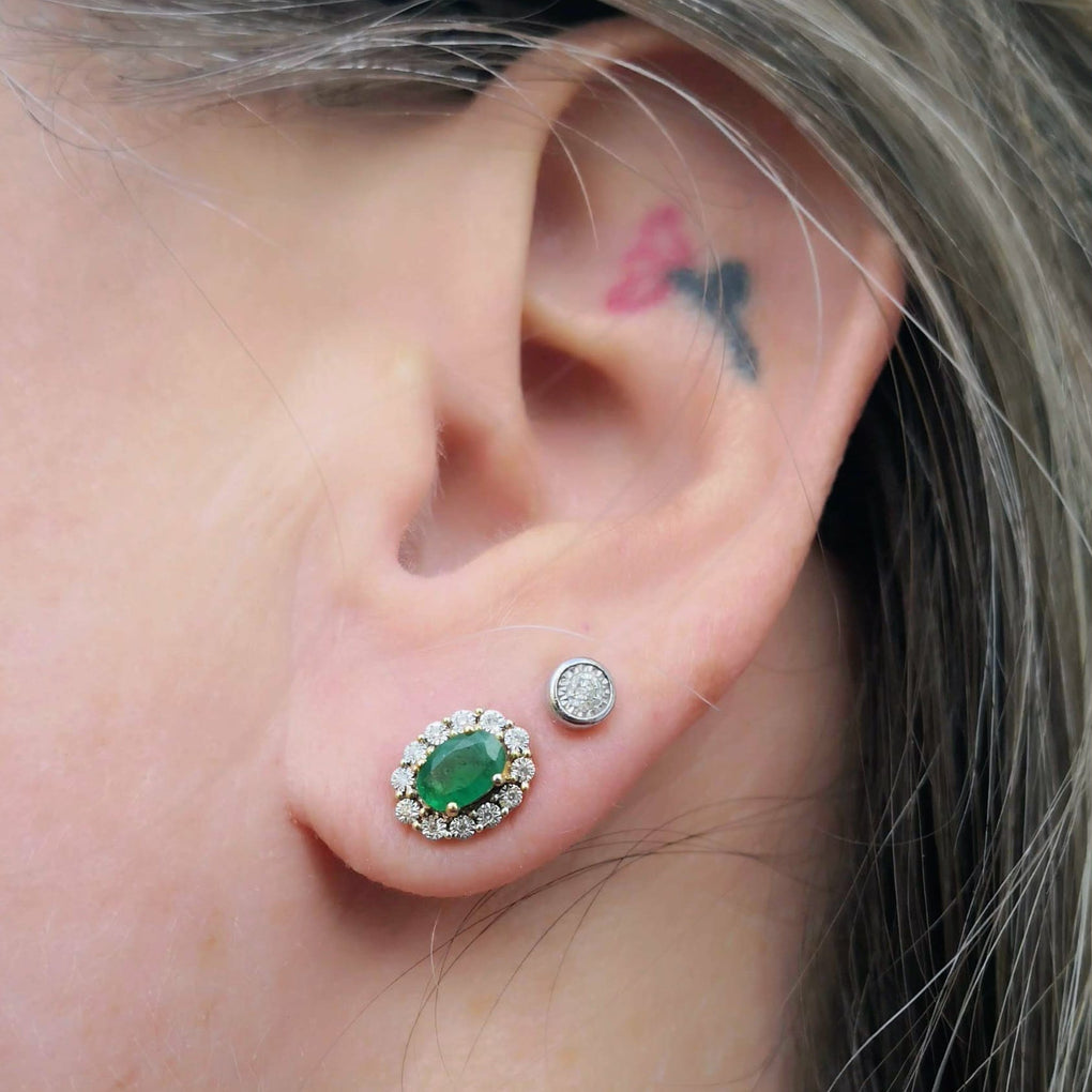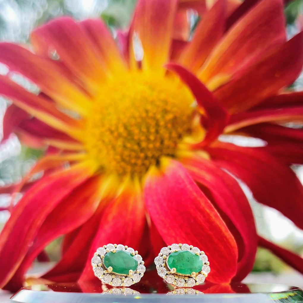 10k Yellow Gold Natural Oval Emerald and diamond Halo earrings