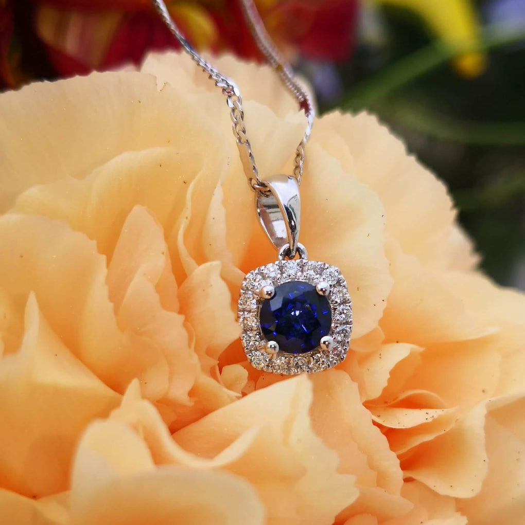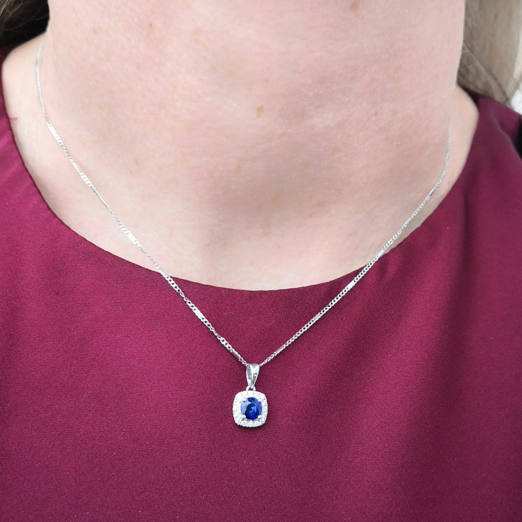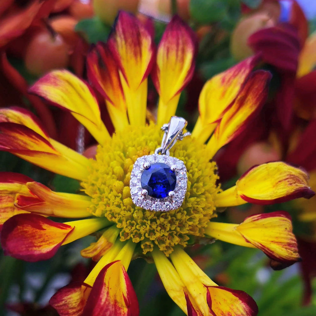 14K White Gold Sapphire and Diamond Halo Pendant