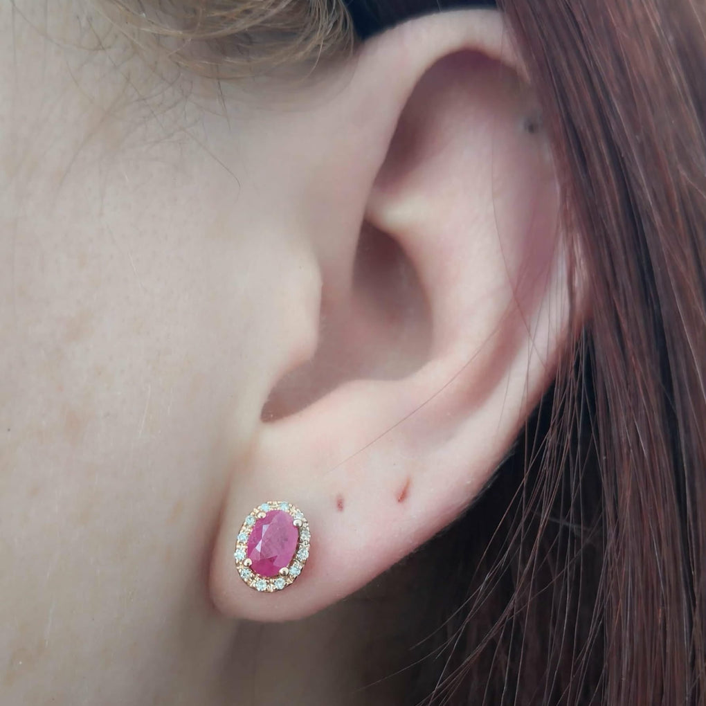 14K Rose Gold Oval Ruby Diamond Halo Stud Earrings
