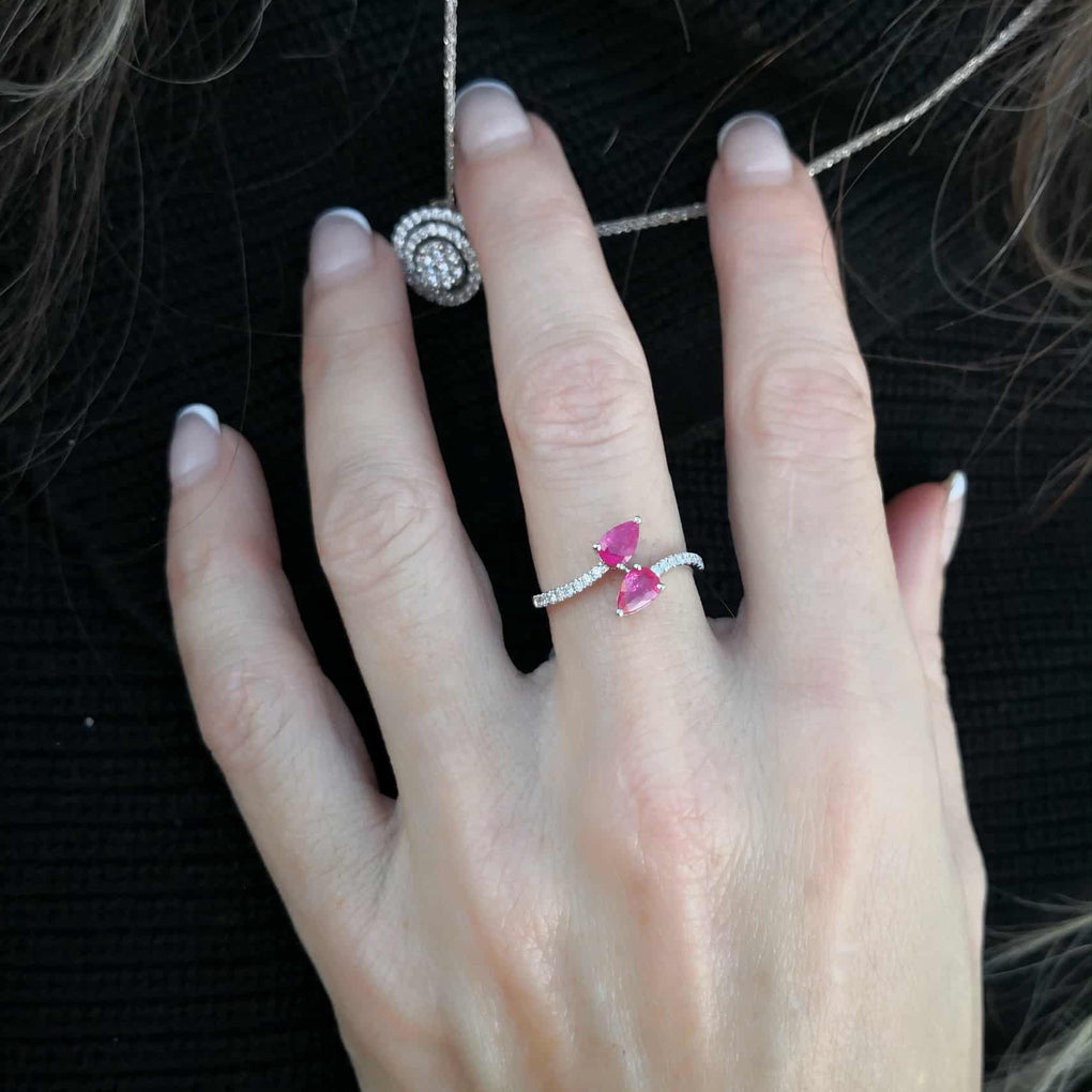 14K White Gold Pear Shaped Ruby and Diamond Bypass Ring