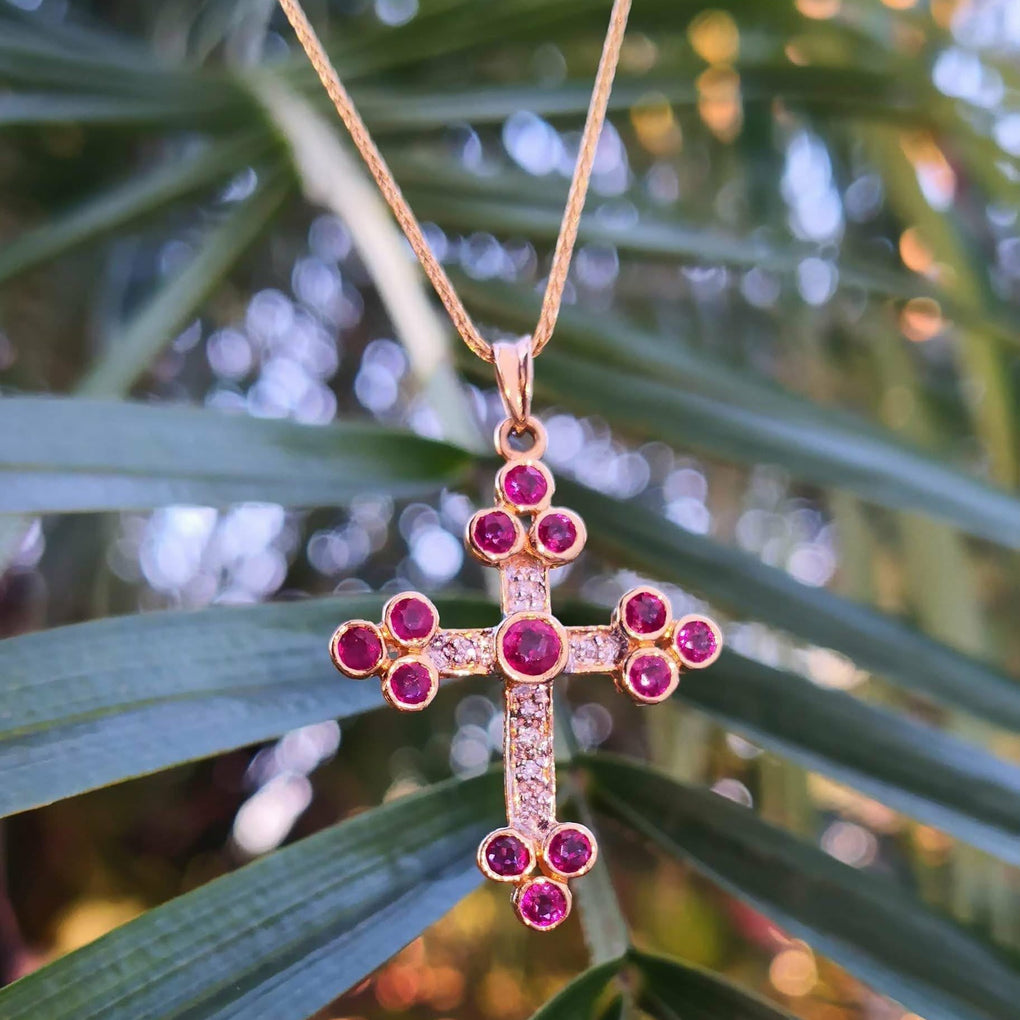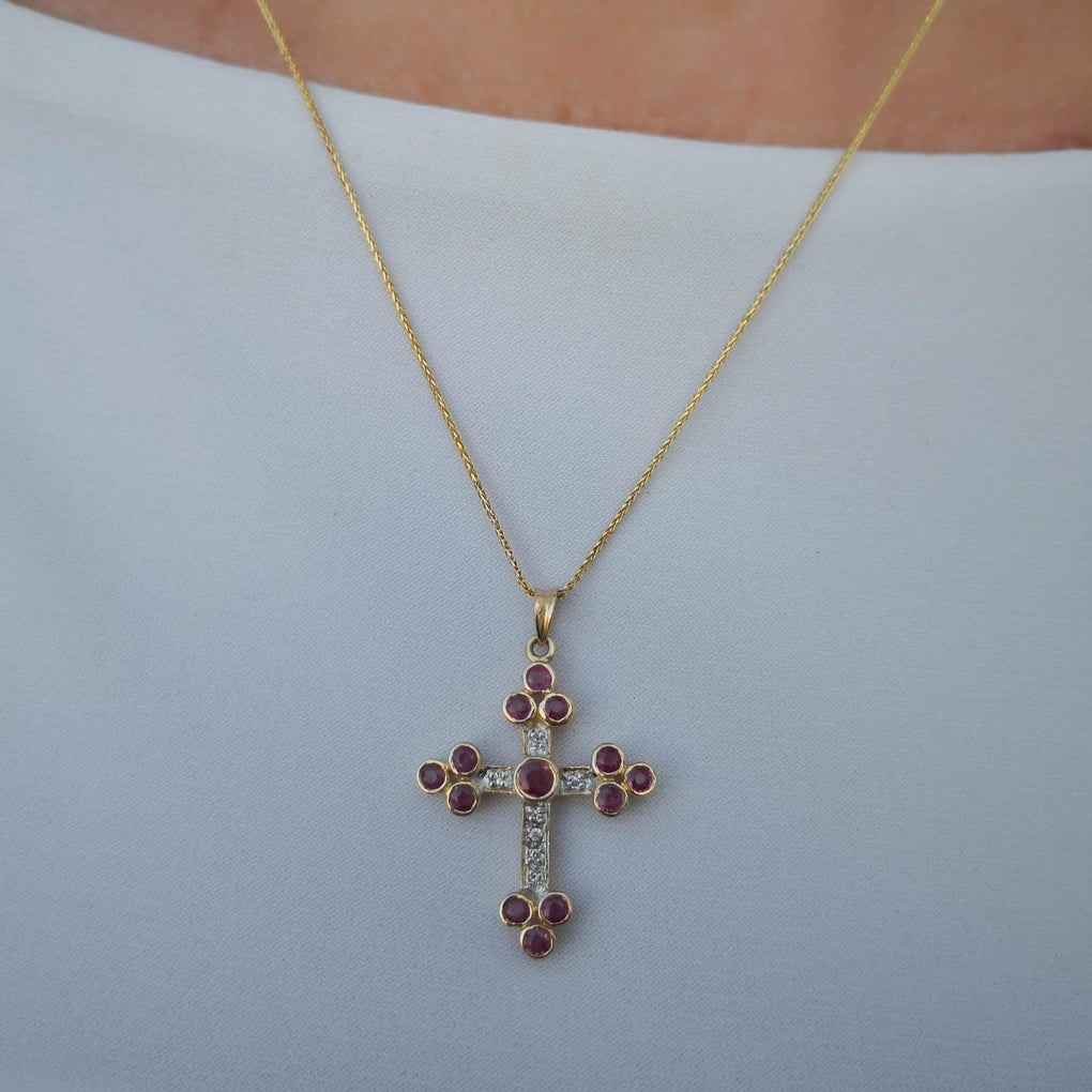 14K Yellow Gold Ruby and Diamond Cross Pendant