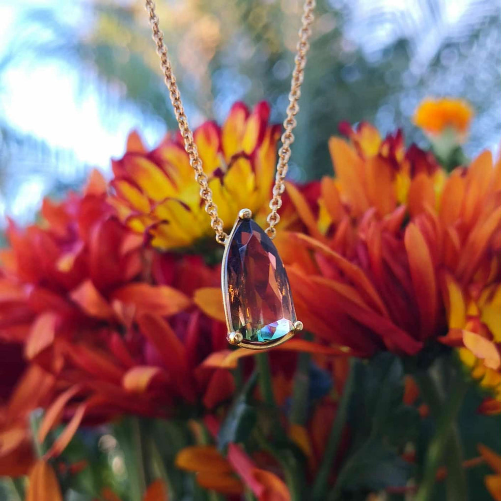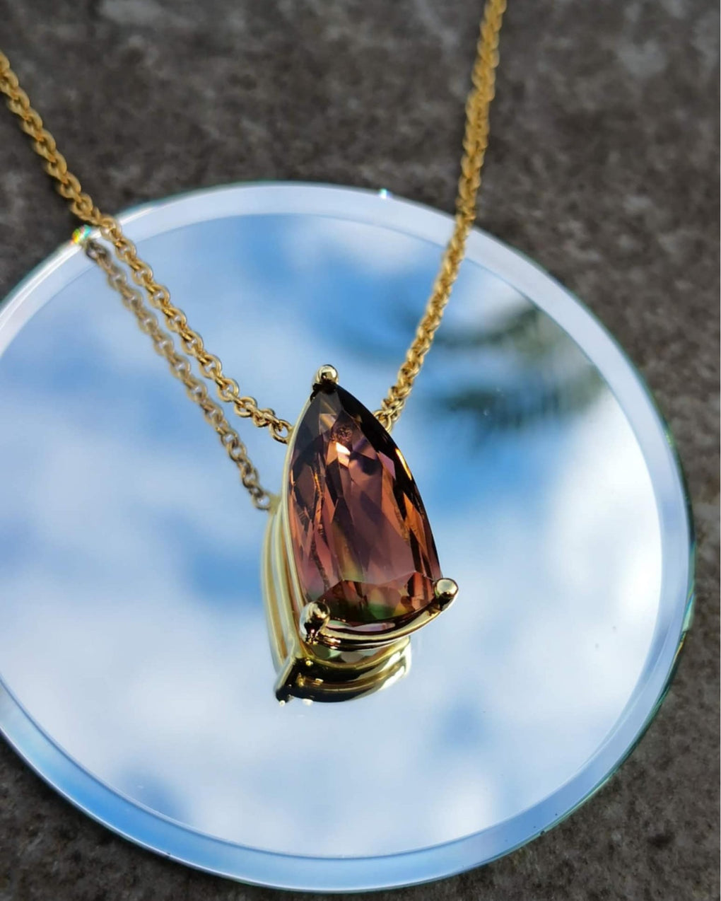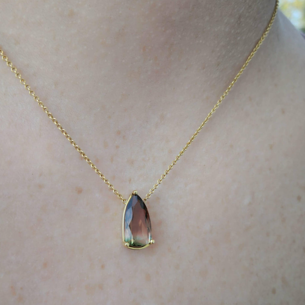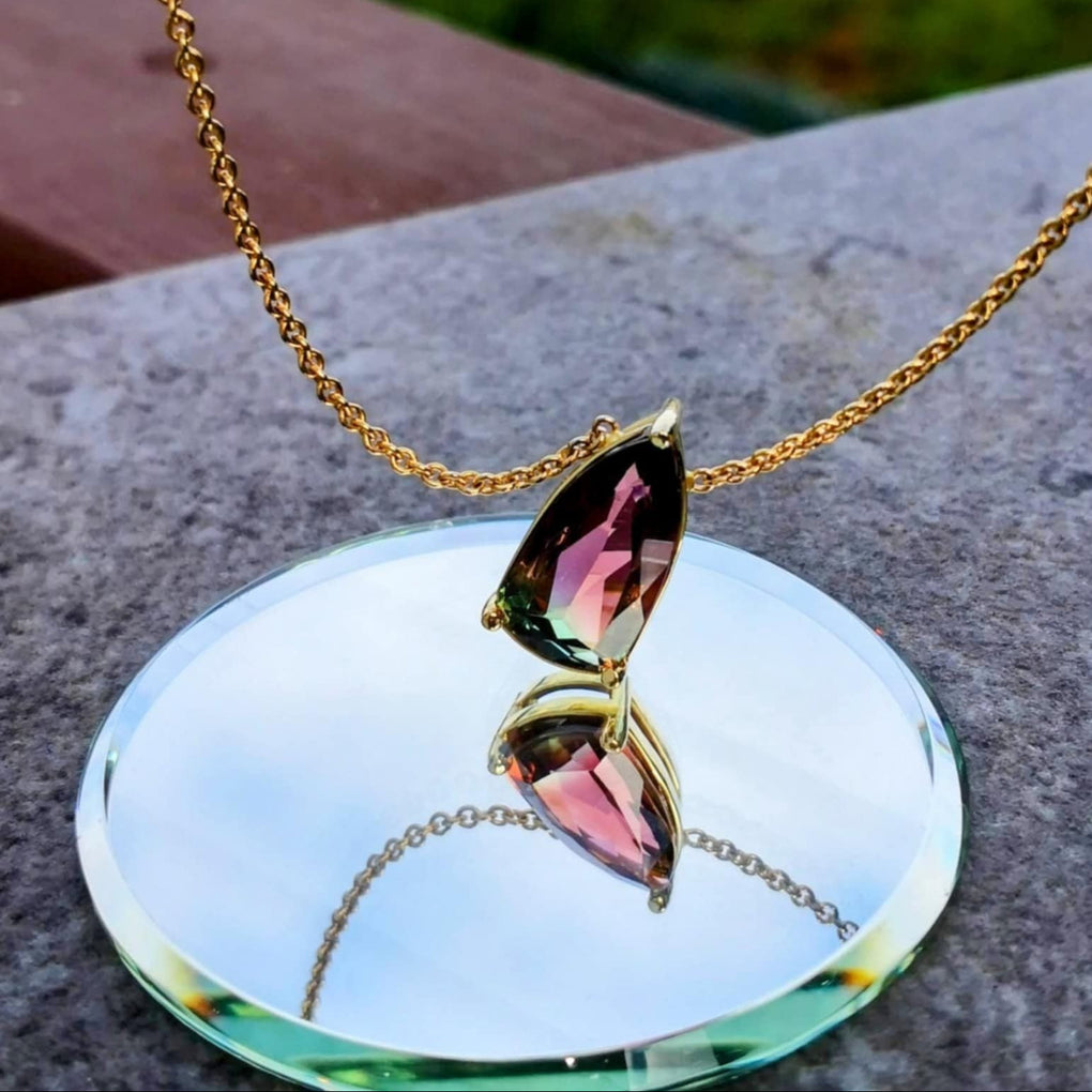 18K Yellow Gold Fancy Pear shaped Watermelon Tourmaline. 18"