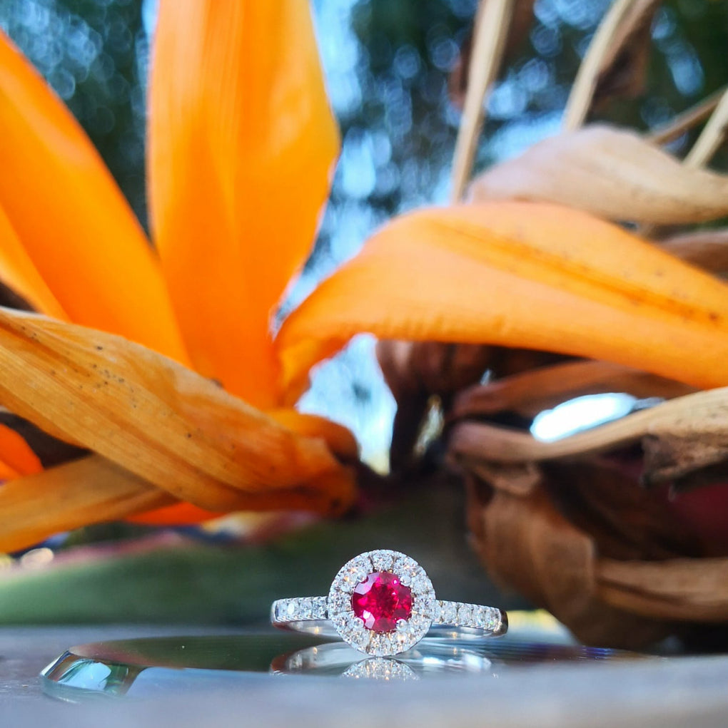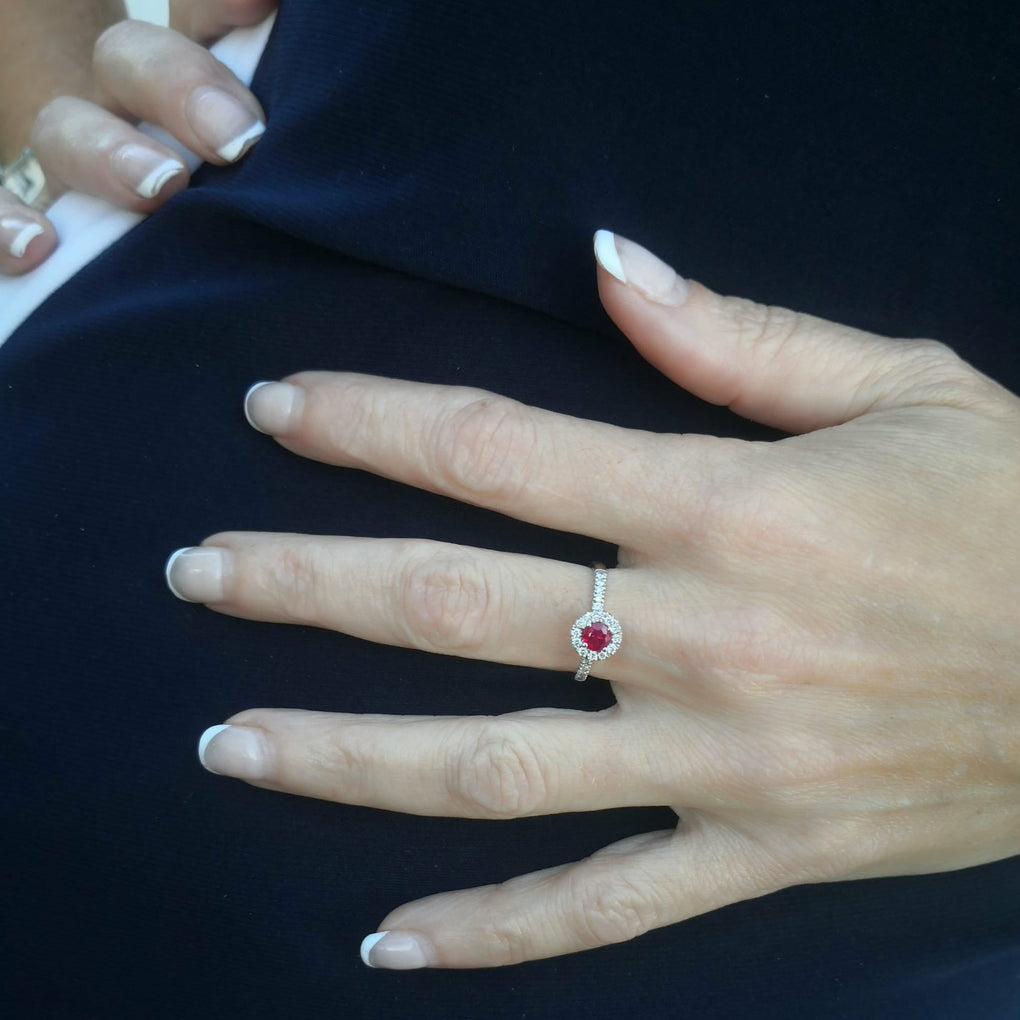 Ruby and Diamond Halo ring 14kt White Gold