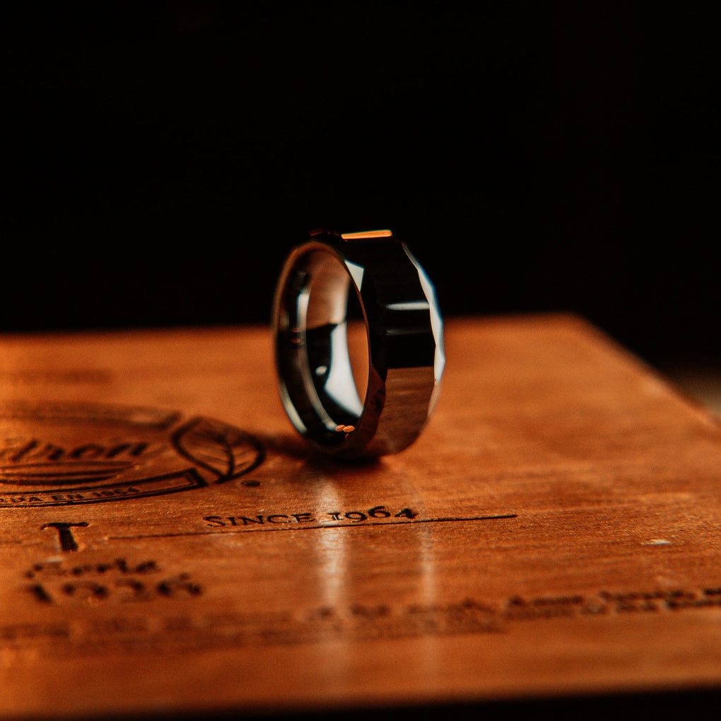 The Vintage Gentleman "Draper" ring showcases a sleek and durable tungsten carbide band, designed for a bold yet refined look. With its 8mm width and polished finish, this ring offers timeless style and strength.