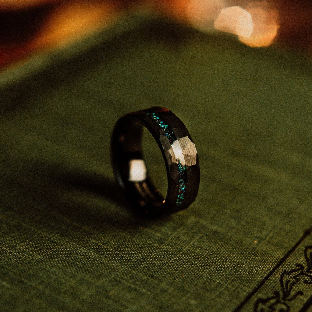 This Vintage Gentleman's "Seven Seas" ring features a striking crushed turquoise and opal inlay, set in durable tungsten for a bold, distinctive look.