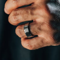 The Vintage Gentleman "Draper" ring showcases a sleek and durable tungsten carbide band, designed for a bold yet refined look. With its 8mm width and polished finish, this ring offers timeless style and strength.