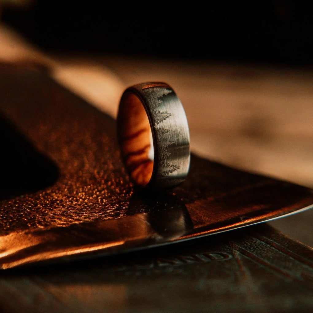 This ring was designed by us with the outdoorsman and adventurer in mind. It features an etched forest background on the durable Tungsten Carbide metal. It also features a whiskey barrel oak wood inner sleeve that will have others admiring the uniqueness and personality of the ring. We think that every man should own a wedding band that fits their personality. Don't settle for a boring ring when you can be proud of the one you wear each day.